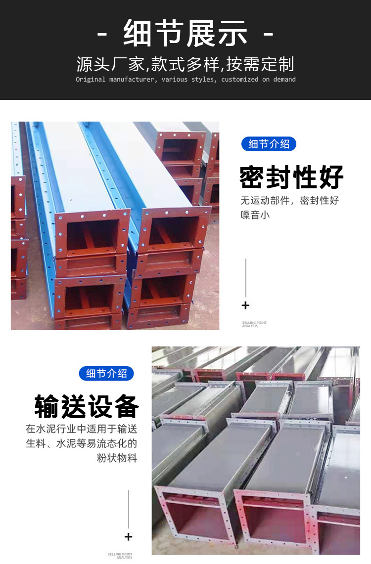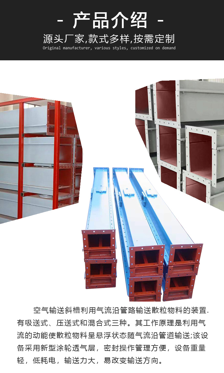 空氣輸送斜槽是通過氣流順管道輸送粉末顆粒物料的裝置。有三種類型:吸入式、壓力式和混合式。其工作原理是利用氣流的動能使顆粒物料隨氣流沿管道懸浮輸送;設備主體部分無傳動部分,采用新型涂層,便于密封操作和管理。
