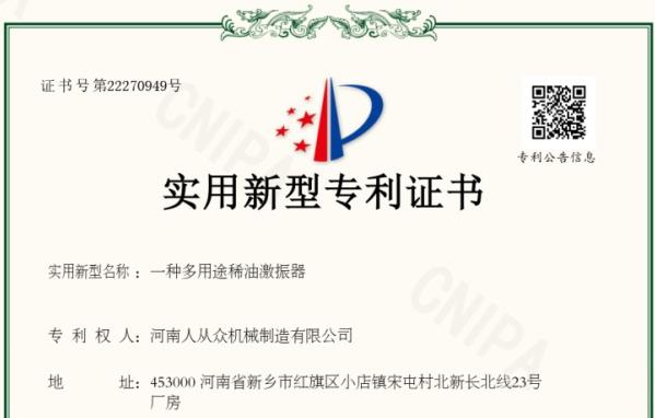 河南人從眾機械制造有限公司多用途稀油激振器專利技術