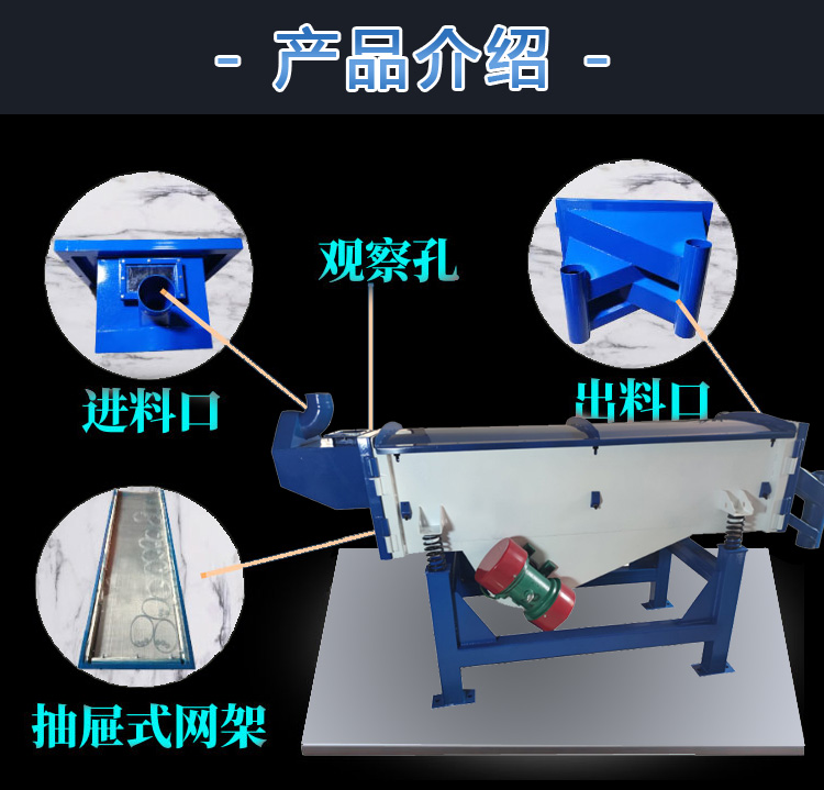 直線振動(dòng)篩迫使物料在篩網(wǎng)上被拋起向前做拋物線運(yùn)動(dòng),以不同的篩網(wǎng)過濾達(dá)到篩分目的。具有高產(chǎn)低耗、自動(dòng)卸料等特點(diǎn),適合流水線作業(yè)。
