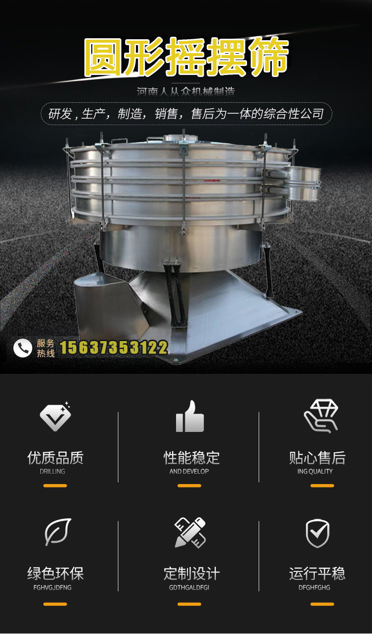 304不銹鋼圓形搖擺篩的仿人工設計極大程度上滿足了物料的高產、高效、高精度篩分需求,它是對原始篩分的機械模擬,相比普通旋振篩它有著高達幾倍的產量,篩分效率更是能達到90%以上,密閉除塵,操作安全。
