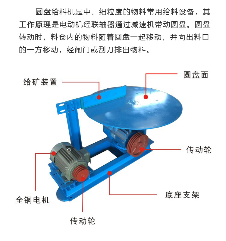轉盤式定量送料機又叫盤式給礦機,圓盤給料機的進料口由接收套筒和接收套筒下方高度可調的調節套筒組成。物料從接收套筒掉落到調節套筒,然后從圓盤和調節套筒之間的間隙泄漏,并由刮板從圓盤上刮下。