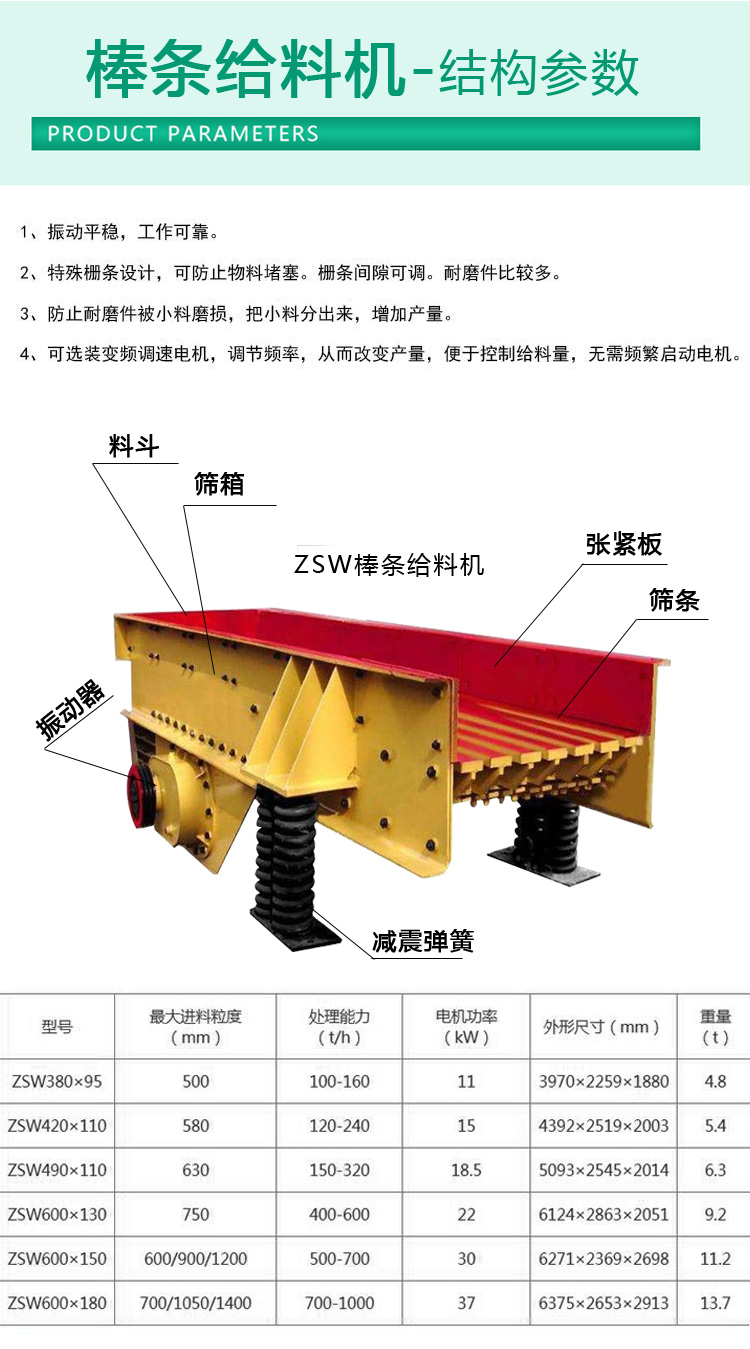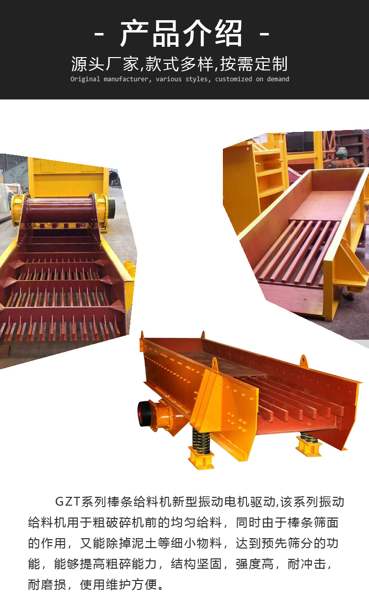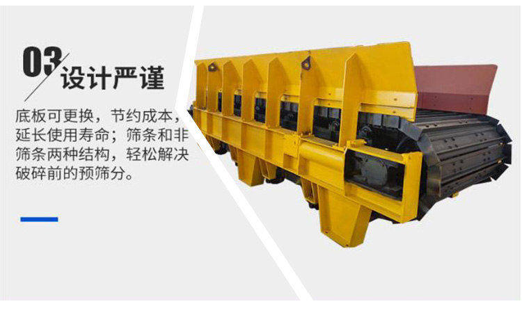 棒條給料機由新型振動電機驅動,它可以去除土壤等細料,實現預篩功能,通常用于破碎機前的均勻給料,提高粗碎能力,結構堅固,強度高,耐沖擊,耐磨,使用維護方便。