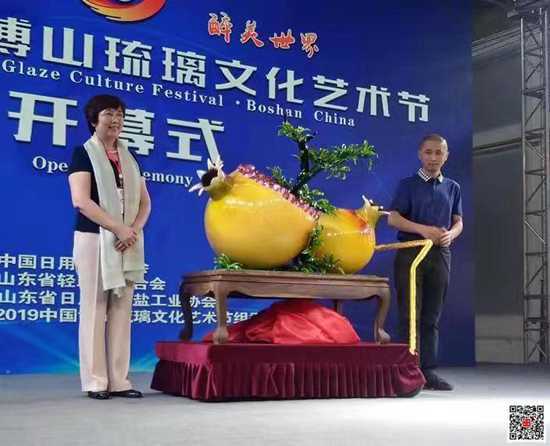 開(kāi)幕式上,孟令彥、鄭舞虹、畢榮青、王樹(shù)槐、王濟(jì)眾、劉忠遠(yuǎn)共同啟動(dòng)2019中國(guó)博山琉璃文化藝術(shù)節(jié)。中國(guó)日用玻璃協(xié)會(huì)向中國(guó)玻璃藝術(shù)大師孫奉柱授予“中國(guó)琉璃葫蘆孫”榮譽(yù)稱號(hào);發(fā)布了2019中國(guó)博山琉璃文化藝術(shù)節(jié)標(biāo)志作品——世界最大的琉璃石榴;介紹了故宮與博山琉璃合作情況;發(fā)布了國(guó)家文化出口基地成果;淄博美陶瓷器有限公司與中科建集團(tuán)山家文旅(淄博)有限公司簽約;淄博愛(ài)美琉璃制造有限公司、淄博康乾琉璃藝術(shù)品制造有限公司與香港藝思公司聯(lián)合成立淄博博思琉璃制品有限公司(琉璃研發(fā)設(shè)計(jì)中心)揭牌;授權(quán)博山區(qū)有代表性的琉璃企業(yè)使用“博山琉璃”地理標(biāo)志。